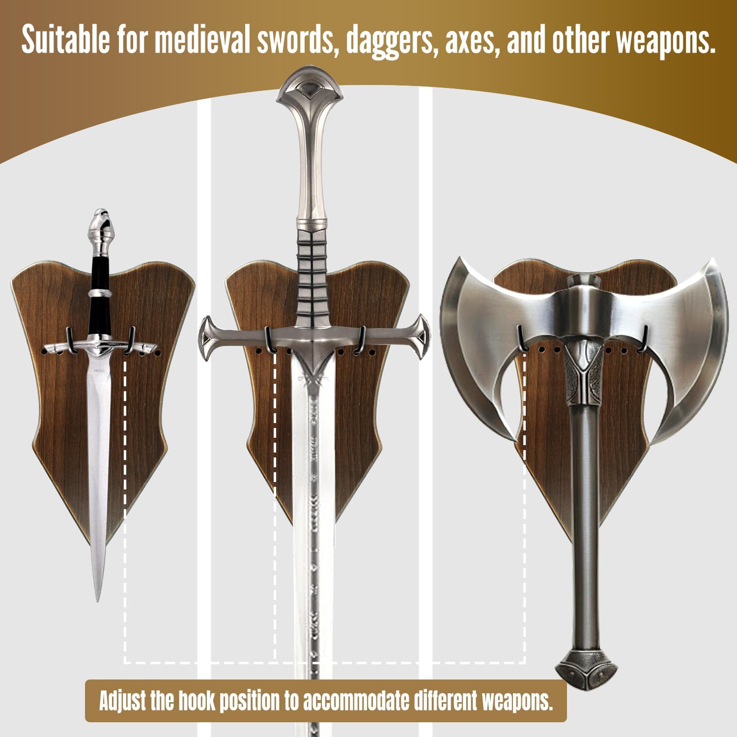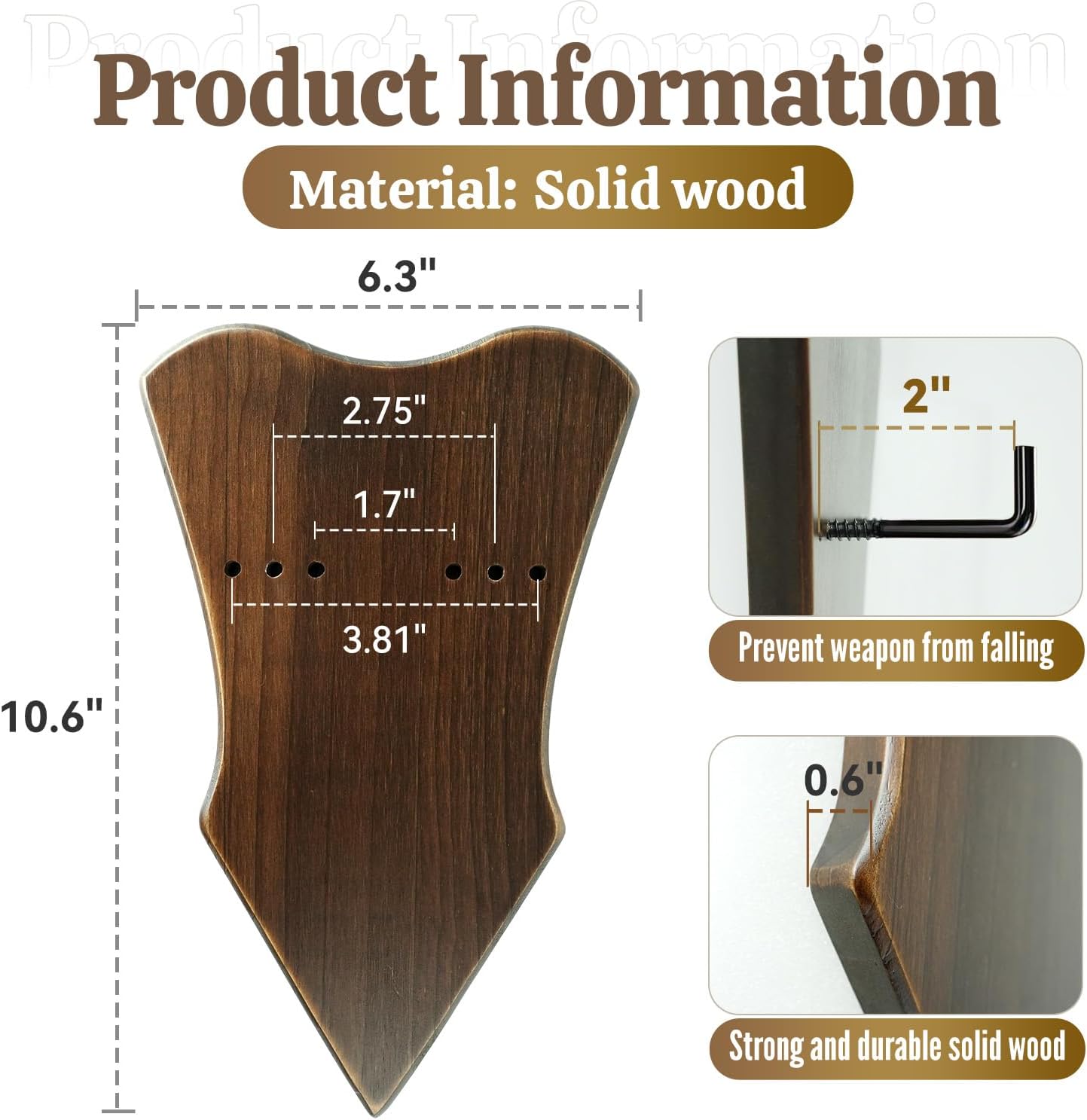 Premium Solid Wood Construction: Crafted from solid wood, our sword display plaque offers superior durability and a natural aesthetic. The surface securely holds your weapons while adding rustic charm to many space. Perfect for displaying medieval swords, daggers, axes, bow, long sword, key blades, kit rae swords ,thunder cats sword and anime collectibles3 Adjustable Hook Positions: Features versatile 1.7", 2.75" or 3.81" hook spacing options to accommodate various weapon sizes. Whether displaying a delicate dagger or heavy long sword, this wall-mounted holder provides perfect support and balanceSpace-Saving Wall Display: Maximize your room's potential with our 6.3"x10.6" plaque that keeps weapons securely vertical. Ideal for collectors needing organized storage in living rooms, bedrooms, offices, or man caves without occupying floor spaceEasy Installation Included: Comes complete with all necessary mounting hardware for quick setup. Simply drill, anchor, and screw - your weapon display will be ready in minutes. The sturdy construction ensures long-lasting support without sagging or loosening over timeVersatile Decorative Accent: Enhance your interior with this medieval-inspired piece that adds vintage character to any setting. Suitable for home decor, gaming rooms, historical displays, or as a unique gift for weapon enthusiasts and collectors